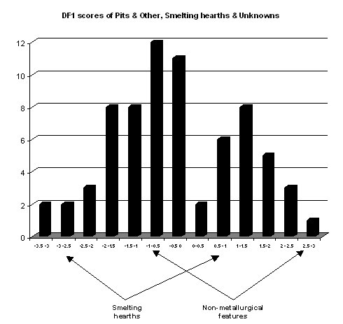Soils were analysed by ICP-AES, and their chemical composition subjected to statistical treatment to attempt to identify any trends in the data. Two distinct groups were identified using multivariate discriminant analysis: smelting hearths and non-metallurgical features. The graph above shows the discriminant function (DF) scores for individual samples within the two groups. These groups are quite well discriminated, but there is a small amount of overlap between them. The arrows indicate the ranges of DF1 scores for the two groups. |