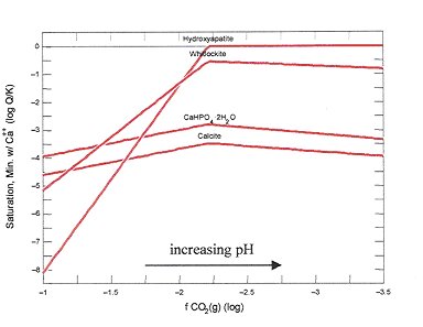 Demonstration of reprecipitation of hydroxylapatite (bone) dissolved in carbonic acid (low pH soil water). As CO2 degasses, hydroxylapatite becomes increasingly less soluble until it precipitates. It precipitates before calcite. Hence, calcite is unlikely to precipitate from a solution of acidic groundwater containing dissolved bone assuming CO2 loss is the reason, as is usual, for calcite precipitation. Computed using The Geochemist’s Workbench (Bethke 1996).