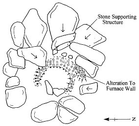 Scotland’s earliest dated (2nd - 1st centuries BC) furnace was recently excavated by Glasgow University Archaeological Research Division (GUARD) at Tarras farm, in Forres, near Inverness. A box-like furnace (figure below) of the Catalan type appears to have had the air supply directed from above. The slag was viscous and could not have been tapped; it appears highly unlikely that the furnace would have been manipulated. Bloomery furnaces and their associated slag heaps, the bloomery mounds, are a common feature in the rural settlements of the Scottish Highlands, the implications being that, like with all other necessities, iron had to be produced locally. No metal was found associated with the Forres furnace (SASAA Report 40, 1998).